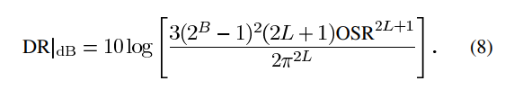 DR_dB = 10log [(3(2^B-1)^2*(2L+1)OSR^(2L+1)) / (2pi^(2L))] (8)