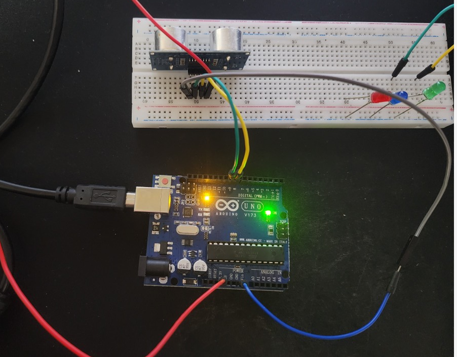 // 초음파 센서와 물체가 가까워지면 LED 수가 많이 켜지고(4개)
